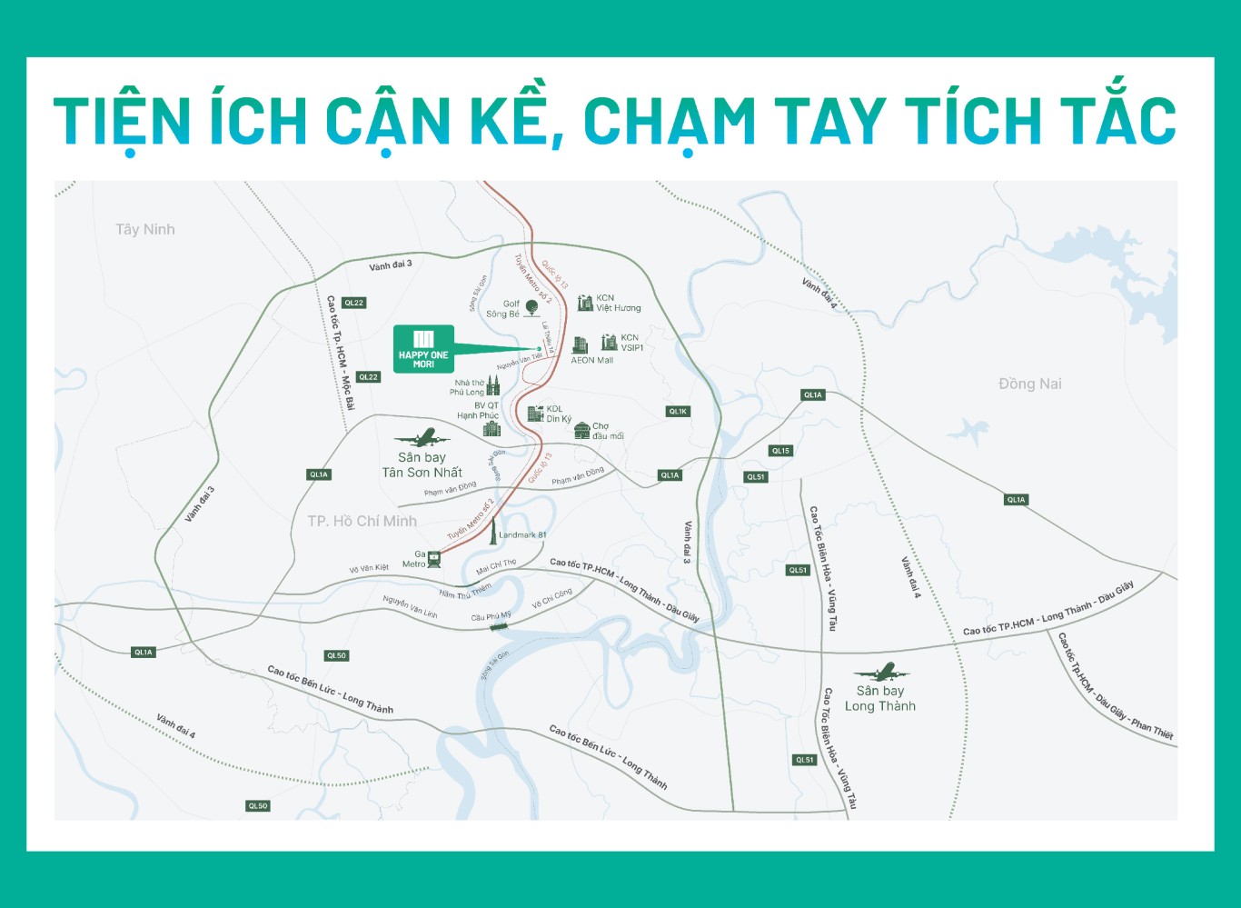 Dự án Happy One Mori sở hữu vị trí chiến lược với khả năng kết nối linh hoạt đến các khu vực lân cận: